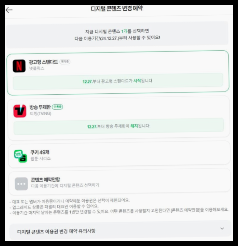 다행히도 디지털 콘텐츠는 매월 변경할 수 있지만, 한 번 선택한 혜택은 다음 달부터 적용됩니다. 예를 들어, 11월에 혜택을 선택하면 실제 이용은 12월부터 시작됩니다. 또한, 기존의 시리즈온 이용권은 2024년 12월 12일 이후로 제공되지 않으니 주의해야 합니다. 광고형 스탠다드 요금제에는 광고가 포함되어 있어 시청 중간에 광고가 나올 수 있습니다. 이러한 점을 미리 인지하고 이용하면 더 원활하게 서비스를 이용할 수 있습니다.