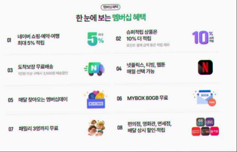 월정액으로 4,900원의 요금을 지불하면, 네이버 쇼핑에서 최대 5%할인 및 최대 10% 적립, 무료배송, 그리고 티빙, 웹툰 등을 매월 선택할 수 있고, 마이박스 혜택을 이용하면 80GB까지 무료로 이용할수 있습니다. 특히, 최근에는 넷플릭스와의 제휴하여사용자들은 추가 비용 없이 넷플릭스를 이용할 수 있는 기회를 얻게 되었습니다.