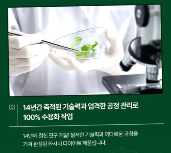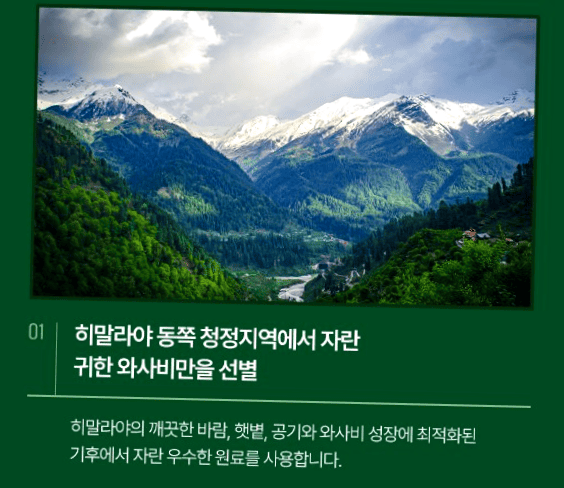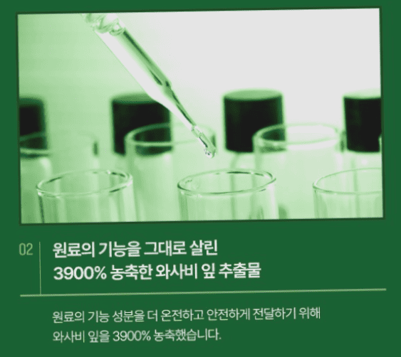 - 3900% 농축 와사비 잎 추출물: 히말라야 동쪽 청정지역에서 자란 귀한 와사비만을 선별하여 3900% 농축한 고품질 원료를 사용합니다.