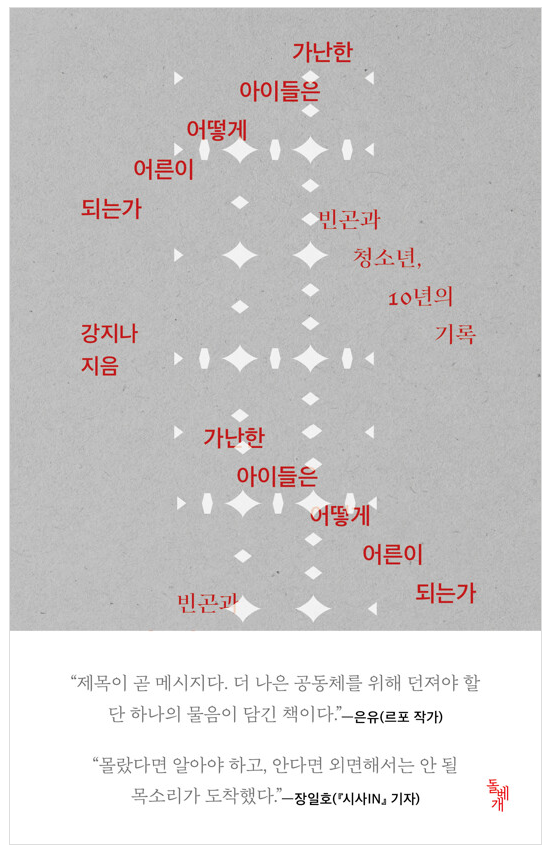 『가난한 아이들은 어떻게 어른이 되는가』는 지금 한국사회의 빈곤에 대한 해부인 동시에, 가난이라는 굴레 속에서 청(소)년들이 어떻게 좌충우돌하면서 삶에 대한 통찰과 지혜를 발견해내는지에 대한 가슴 시린 성장담이다. 또한 기존 청(소)년 담론에서 지워진 사람들, 즉, 특성화고나 2, 3년제 대학 졸업생, 학교 밖 청소년, 불안정 노동자들의 이야기이자, 1990년대에 태어나 2010년대에 청소년기를 보내고 2020년대에 청년기를 지나고 있는 사람들의 이야기이기도 하다.