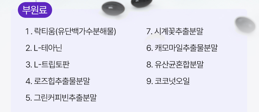 닥터블릿 푸응 나이트버닝 프로는 까다롭게 엄선하여 배합한 락티움, L-테아닌, L-트립토판, 로즈힙추출물분말, 그린커피빈추출분말, 시계꽃추출분말, 캐모마일추출물분말, 유산균혼합분말, 코코넛오일 등 9종의 부원료를 함유하고 있습니다.