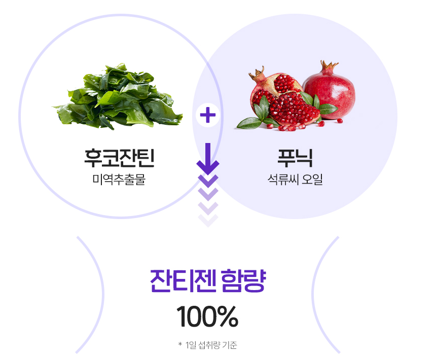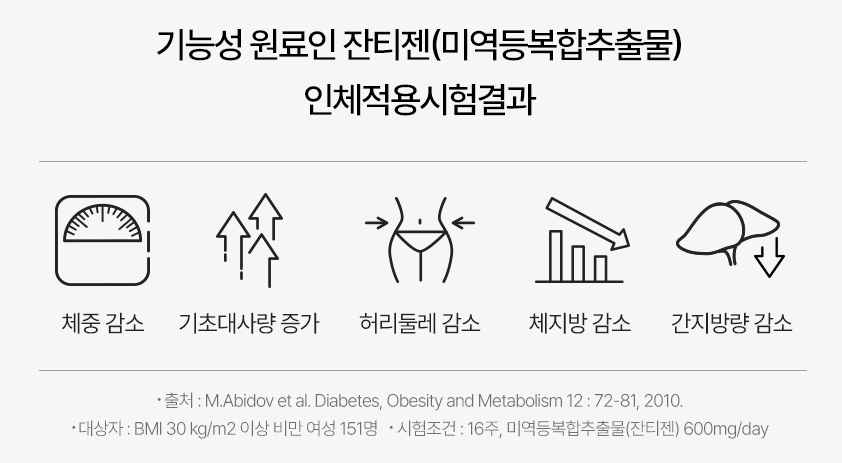 잔시텐은 식물성 원료인 미역 추출물의 후코잔틴과 석류씨 오일의 푸닉산을 배합한 다이어트 개별인정형 원료로 " 체지방 감소에 도움을 줄 수 있습니다."